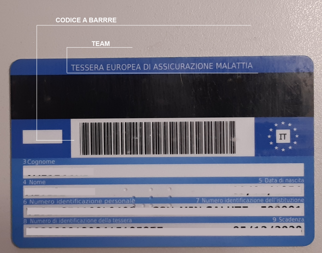 E' la TS che va utilizzata nei paesi europei per l'assistenza sanitaria quando ci si trova all'estero (Tessera Europea Assicurazione Malattia). Il codice a barre che si vede nella figura sottostante contiene il codice fiscale del titolare della TS, ed è indispensabile per la lettura rapida della TS in farmacia e/o all'ingresso/uscita dei corsi di Formazione Continua in presenza, quando il rilevamento presenze lo prevede.